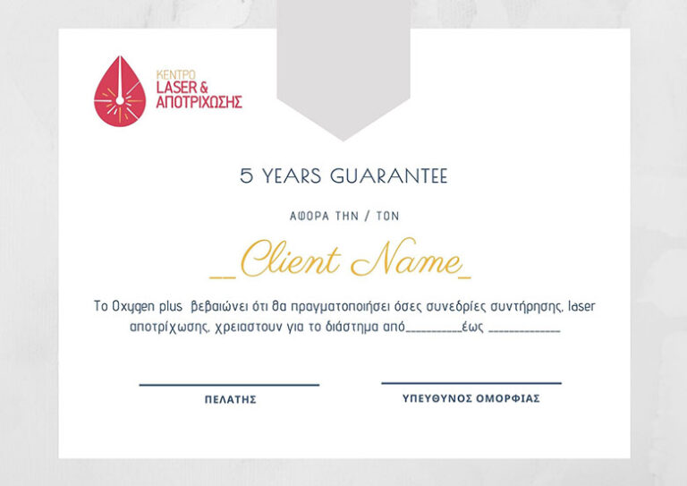 Η 5ετής, γραπτή εγγύηση αποτελέσματος σημαίνει για το πελάτη μας οτι θα έχει απεριόριστο αριθμό συνεδριών (όσες χρειαστούν) στα 5 χρόνια, ανεξάρτητα αν αυτό οφείλεται σε ορμονικούς ή άλλους λόγους.